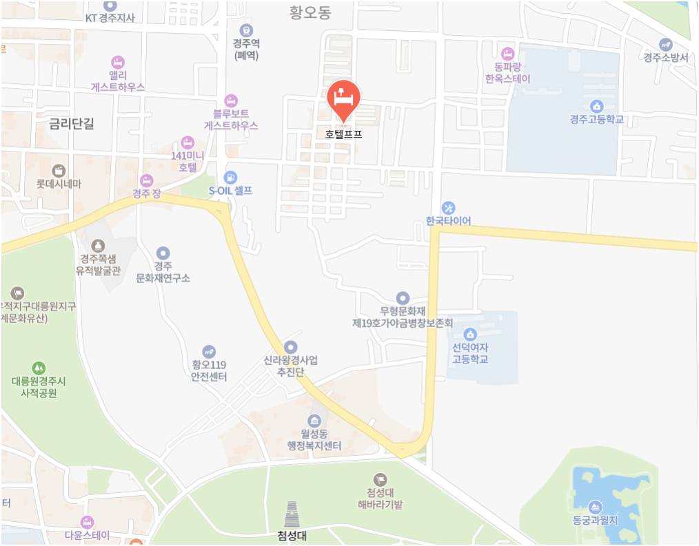 '호텔프프'는 경주 황리단길 중심부에서 도보로 5분~10분 거리에 위치해 있어 경주시내권 관광하기에 좋습니다.