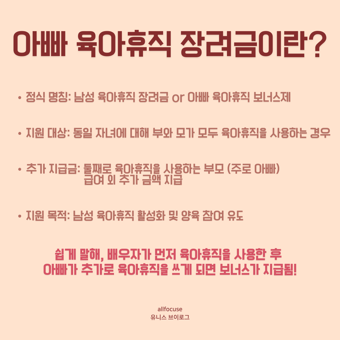 - 정식 명칭: 남성 육아휴직 장려금 또는 아빠 육아휴직 보너스제